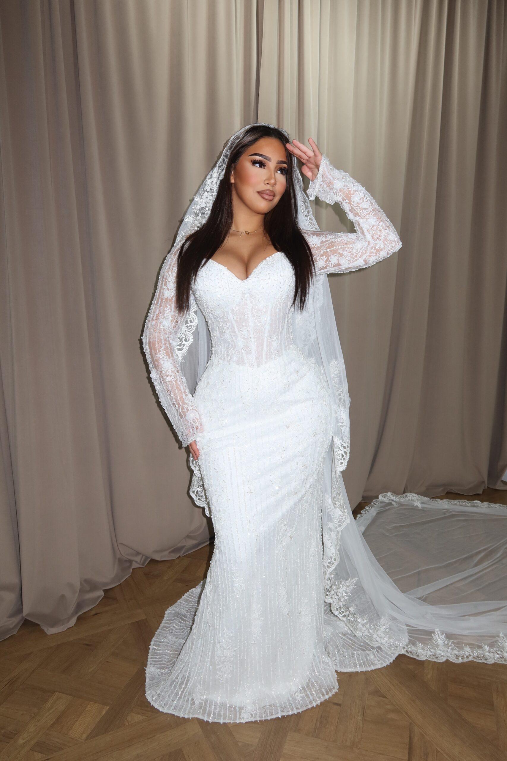 Forme: Sirène , col coeur , taille droit , longues manches transparentes